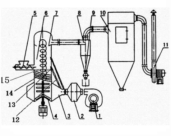 從入料口處放入,通過傳輸帶進(jìn)入干燥室內(nèi)。引入適量熱介質(zhì),與熱介質(zhì)充分接觸后,閃蒸干燥機(jī)開始對(duì)物料進(jìn)行干燥過程。在此過程中,分機(jī)器收集顆粒較小的物料,大顆粒繼續(xù)保留在干燥室內(nèi),直至粒度符合要求。